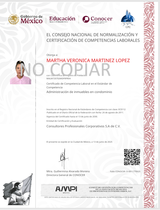 - Certificación RED CONOCER RENAP 11779925 a nivel Nacional (2025), que avala mis competencias profesionales en administración de inmuebles en régimen condominal según los estándares oficiales reconocidos por la Secretaría de Educación Pública y la Secretaría del Trabajo a través del Sistema Nacional de Competencias.